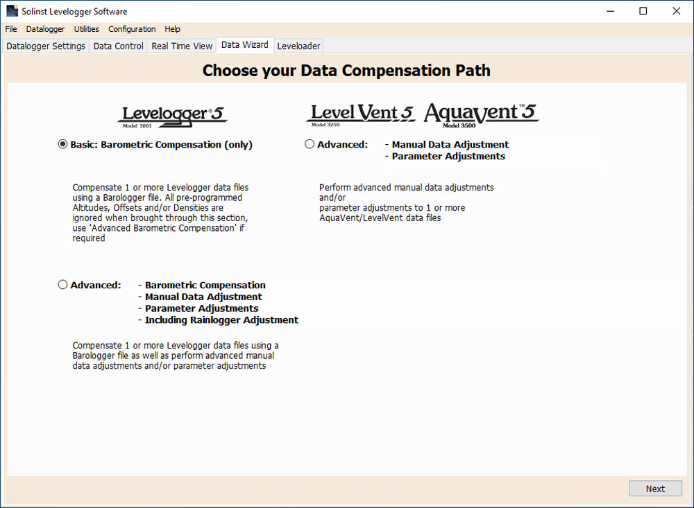 Nel programma "Solinst Levelogger Software" è disponibile una procedura guidata per la compensazione automatica dei dati, è sufficiente cliccare sulla scheda "Data Wizard" e si aprirà una procedura che ci guiderà per la Compensazione Barometrica o per le correzioni manuali dei dati (per esempio per aggiungere o togliere un offset fisso come potrebbe essere la quota di installazione dello strumento).